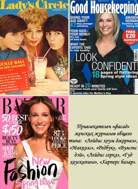 Женская печать все больше напоминала слепок с американского общества. Вниманием не обошли ни одной возрастной, социальной, этнической группы женщин, объединенных рядом общих признаков: девушек-подростков, учащихся колледжа, невест, молодых матерей, жительниц пригородов, жен военнослужащих, негритянок, представительниц элиты, американок из рабочего класса — каждая из них могла считать «своим» один или сразу несколько журналов. Но в каждом читательница обнаруживала, как правило, только один из трех традиционных «гарниров», которыми женские издания общего типа снабжают основное рекламное блюдо, — или моду, или домоводство, или беллетристику. Статьи по данным вопросам тщательно приноравливались к возрастным, экономическим или семейным запросам американок.