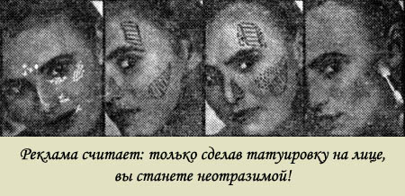 Сами женщины прекрасно об этом осведомлены, но подчиняются любым капризам индустрии косметики и моды, лишь бы не оказаться в изоляции. Приходится только удивляться этому явлению массового гипноза. Даже видавшая виды буржуазная пресса с ужасом пишет порой о тех или иных диких увлечениях модой. Например, после выхода на экраны США фильма «Татуо», главным героем которого был некий художник, рисовавший свои картины на теле любимой девушки, предприимчивый делец, подхватив «идею», изобрел доступный всем способ «украшения» собственного тела с помощью кисточки и специальных несмываемых красок. И пошли гулять по улицам Нью-Йорка красотки с полосатыми и клетчатыми лицами, с нарисованными на щеках, шее, руках и других частях тела бабочками, мышками и змеиными головами. Даже самые изысканные женщины уже отдали дань новой моде, и на важных приемах появляются дамы с красными ушами или нарисованной на щеке гвоздикой. Уже готовятся к производству и увесистые косметические наборы, в которые включены баночки с красками для совершенно свободных вариаций на собственном теле.