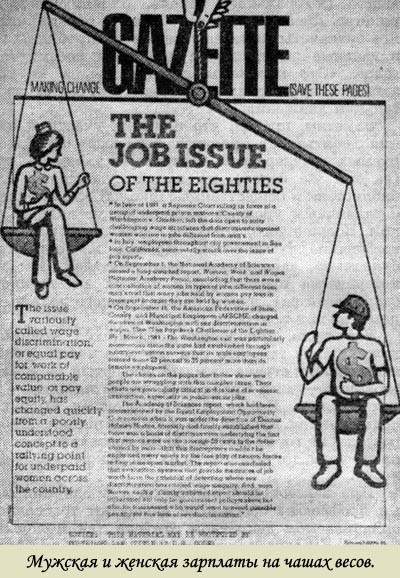 Забавный парадокс, по мнению социолога Л. Холмстрим, заключается в том, что никто не упрекает мужчин в США за то, что они бросают работу ради службы в армии, ради необходимости натренироваться убивать других представителей рода человеческого. Женщин же беспощадно критикуют за то, что они подводят предпринимателей, вознамерившись дать жизнь новым поколениям. Парадокс и в самом деле «забавный». Но это не мешает тому, чтобы отказывать женщинам в профессиональной подготовке, в выдвижении на ответственные посты, в справедливой оплате труда. Кстати, о последнем. В США любят