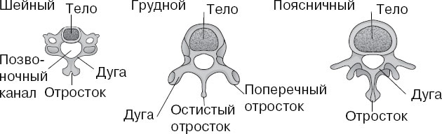 Позвонки всех отделов позвоночного столба имеют схожее строение – состоят из тела (передняя часть) и дуги (задняя часть). Тело является опорной частью позвонка. Позади тела располагается дуга, которая соединяется с телом при помощи двух ножек, образуя позвоночное отверстие Отверстия всех позвонков составляют позвоночный канал, в котором располагается спинной мозг.