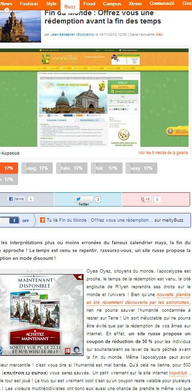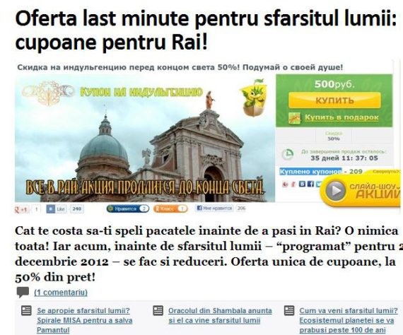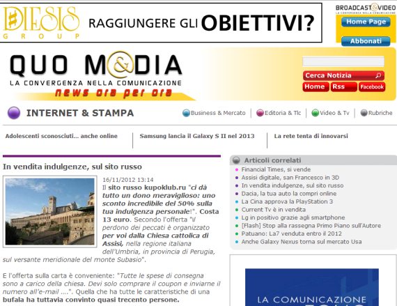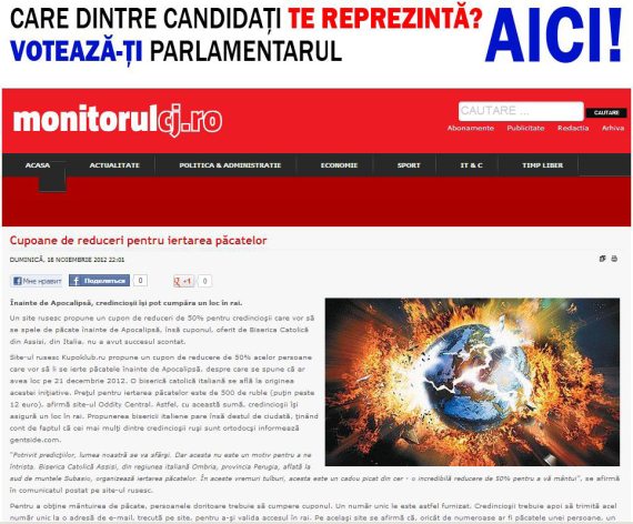И, да, расскажу вам вещи, которые, собственно, получались у нас с индульгенцией, коротко пробежимся. Вот, допустим, наша индульгенция – новость номер один. То есть: сначала она вышла как купон, мы этого не учли, не упомянули нигде клиента. А потом пришла идея сделать логотип – там был дракончик, потом он стал везде фигурировать. Новость, первая страничка, куча публикаций: «Россияне хотят подготовиться к концу света», итальянская пресса, чего-то Сталина приплели.