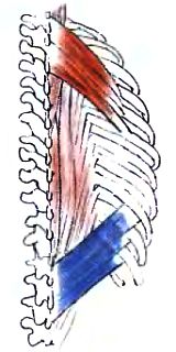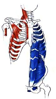 Рис. 1.16. Верхняя зубчатая мышца (отмечена красным цветом) увеличивает объем грудной клетки, а нижняя (отмечена голубым цветом) уменьшает его.