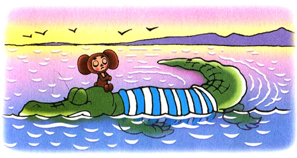 Крокодил Гена и Чебурашка переплывают реку.
