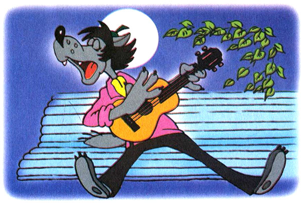 Волк сидит на скамейке во дворе и, надрывая глотку, поёт под гитару «Расскажи, Снегурочка, где была???»