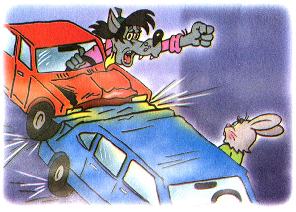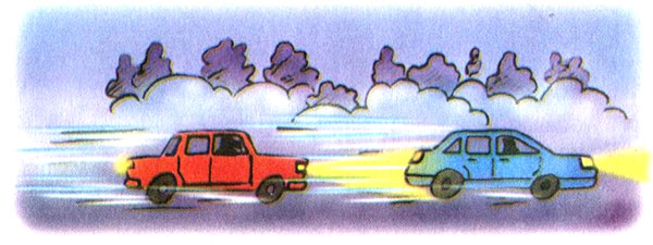 Ночь. Туман. Водитель «Жигулей» пристроился за впереди идущей машиной, что называется «повис на хвосте», едет впритык, посвистывает. Машина влево — «Жигули» тоже влево, машина вправо — «Жигули» за ней. Вдруг машина резко останавливается. «Жигули» с маху в неё врезаются.