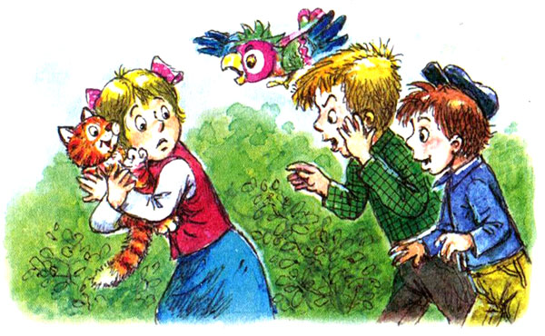 Вот летит он и видит — бежит девочка с кошкой на руках, а за ней мальчишки бегут и кричат: