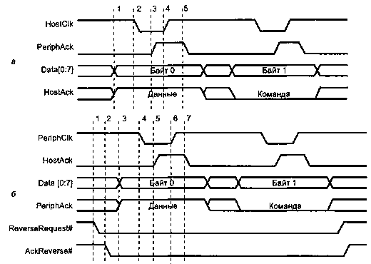Из рис. 1.5 видно и другое отличие ЕСР от EPP. Протокол EPP позволяет драйверу чередовать циклы прямой и обратной передачи, не запрашивая подтверждения на смену направления. В ЕСР смена направления должна быть согласована: хост запрашивает реверс установкой