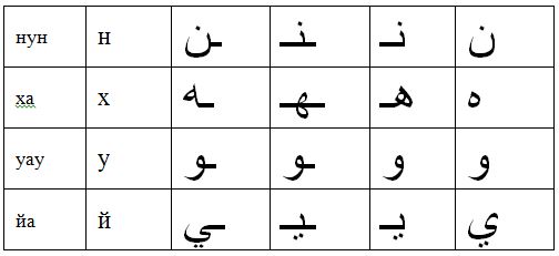 Арабский алфавит состоит из 28 букв. Одни буквы соединяются с соседними буквами в словах с обеих сторон, а другие соединяются только справа, поэтому их написание совпадает в начальном, и обособленном вариантах, а также в срединном и конечном. Слова пишутся справа налево и строчки пишутся сверху вниз. Каждая буква арабского алфавита имеет четыре варианта написания: обособленный, начальный, срединный и конечный. В таблице ниже каждая буква арабского алфавита показана в нескольких вариантах написания.