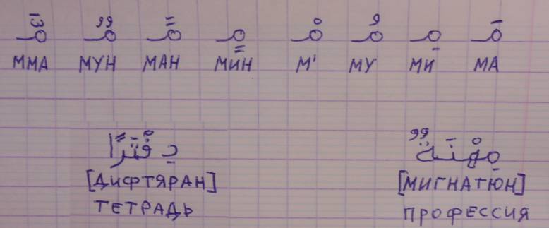 Здесь в слове [дифтяран] две чёрточки относятся к последней букве «Алиф», и поэтому окончание читается «ан». Серединная буква «т» здесь мягкая, поэтому в транскрипции мы используем написание «тя» вместо «та». Трудности чтения арабских книг, газет и журналов заключается в том, то в большинстве изданий харакец не печатают и читателю приходится ориентироваться на свои знания арабских слов. Так же как и во многих русских текстах не печатают точки над буквой «Ё». Харакец обязательно печатают в школьных учебниках для первого класса.