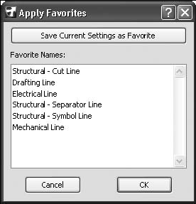 В левом верхнем углу окна Line Default Settings (Настройки параметров линии по умолчанию) расположена кнопка Favorites (Избранное) – это элемент запуска одного из самых полезных инструментов, использующихся для упрощения и ускорения работы пользователя.