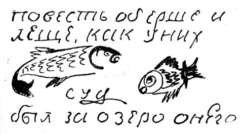 А Ерш ночь ночевал и две ночевал... Год жил и два жил!.. И наплодилось в озере Онеге ершей втрое, впятеро против лещей. А рыба Ерш ростом мала, да щетина у ей как рогатины. Почали ерши по озеру похаживати, почали лещей под ребра подкалывати. Да те ершовы дочери со своима барабан нагуляют, а на леща сказывают. В суд леща тянут, просят с леща на родины и на истины, на именины и на хоропйни'ны.
