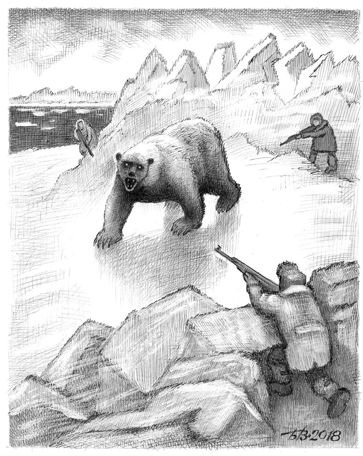 Я поднялся на торос и оторопел. Из воды на кромку льда поднимался медведь. Вот он вышел на лед, отряхнулся, повел по сторонам носом и, не спеша, заковылял в мою сторону. Я скатился с тороса и, как позволяли силы, побежал к палатке. Как только я сказал о медведе, ребята – за карабины. Быстро решили: я и Данилыч расходимся в правую и левую стороны метров на сто вдоль гряды торосов, чтобы обжать зверя с флангов. Дойдя до гряды, медведь может пойти вдоль нее в ту или другую сторону, и кто-то из нас должен его достойно встретить. Виктор, к этому времени достаточно ослабевший физически, должен оставаться на месте, вблизи собак. И если