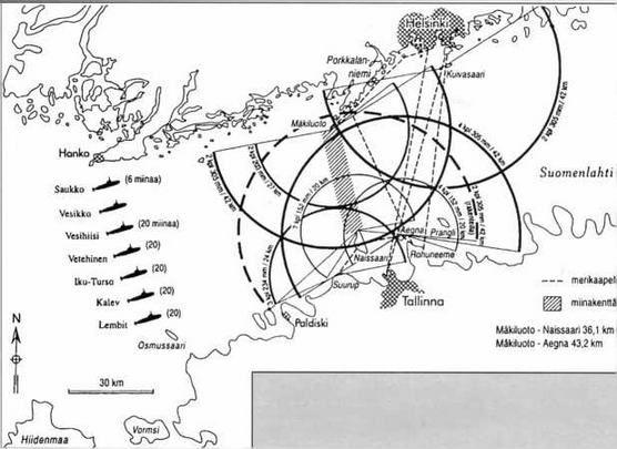 1935-39 гг. С 1935 по 1939 г. было проведено несколько совместных учений береговой артиллерии Финляндии и Эстонии. На них отрабатывалась, в т.ч. единая система управления огнем береговой артиллерии, для чего между батареями на финском о. Мякилуото и эстонском о. Аэгна был проложен защищенный телефонный кабель, позволявший эстонцам направлять огонь 203-мм и 305-мм батарей Мякилуото, а финнам - 305-мм эстонской батареи. Кроме того, на эстонском о. Найссаар был построен запасной пункт управления огнем финских батарей о. Мякилуото. Для того времени подобные учения для стран, официально не состоявших в военном союзе были абсолютно уникальными! Эстония и Финляндия, как планировалось, могли бы сосредоточить огонь восьми 305- мм, шестнадцати 254-мм, четырех 234-мм, двух 203-мм, тринадцати 152-мм и трех 130-мм орудий, которые могли бы выпустить по прорывающемуся советскому флоту около 1000 снарядов за 5-6 минут. Кроме того, за позицией должны были размещаться еще и пять финских и две эстонских подводных лодки.