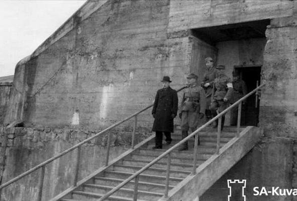 Президент Финляндии Ристо Рюти выходит из орудийного блока 12-дм. батареи «Форта Мякилуото». В этот день президент открыл на острове памятный знак погибшим во время Зимней войны 1939-40 гг. и Войны-продолжения 1941 г. 30.09.1941 г.