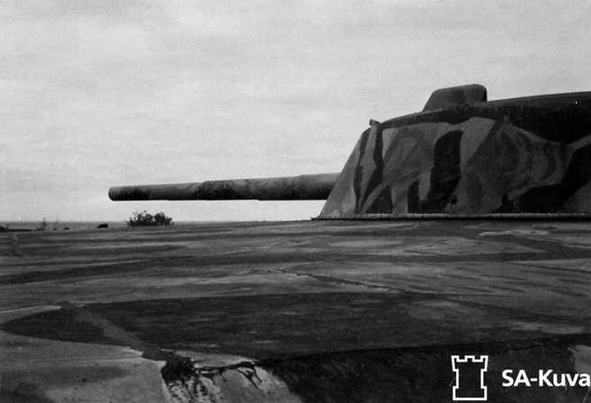 1939-44 гг. Вторая Мировая война. Перед советско-финской («Зимней») войной 1939-40 гг. финское командование поставило задачу батареям на островах Мякилуото и Куйвасаари в сотрудничестве с эстонской батареей на острове Аэгна ограничивать свободу передвижения советского флота в Финском заливе. Однако тяжелые ледовые условия не позволили советским кораблям развернуть активные боевые действия против финского побережья, ограничившись редкими обстрелами, так что 305-мм батарея Мякилуото не смогла себя проявить. Советские самолеты несколько раз бомбили Мякилуото, не попав по целям на острове из-за большой высоты сбрасывания бомб. ПВО острова была усилена установкой нескольких зенитных орудий. В феврале 1940 г. из частей береговой обороны был сформирован батальон, принявший участие в тяжелых боях на Карельском перешейке. В начале 1941 г. личный состав батареи насчитывал 200 человек. В начале Великой Отечественной войны (или, как ее называли финны, «Войны-продолжения») в июне-июле 1941 г. советские самолеты усиленно бомбили остров, правда, без особых успехов. Свою первую стрельбу по советским кораблям 305-мм батарея №1 «форта Мякилуото» провела 3.07.1941 г. Батарея в 18:16-18:40 (время указано московское, финское время на час назад) сделала 4 безрезультатных выстрела на дистанцию 23 км по ставившим мины в районе о. Нарген минзагу «Марти» и трем тральщикам, пока цели не скрылись за поставленной торпедными катерами дымовой завесой. При заряжании первого снаряда в правый ствол 305-мм орудия оторвался трос зарядника, так что он заблокировался в верхнем положении. В результате стрельбу вел только левый ствол, однако его вертикальное наведение осуществлялось вручную, так как электропривод находился в ремонте. Третий снаряд лег довольно близко от минзага, однако повреждений корабль не получил.