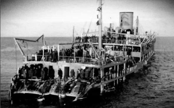 Тяжело поврежденный турбоэлектроход "Иосиф Сталин" (ВТ-521) на мели у эстонского побережья. Финны утверждали, что именно попадание 305-мм снаряда в 3:20 3.12.1941 г. нанесло судну смертельные повреждения. Однако по факту это было результатом очередного подрыва на мине