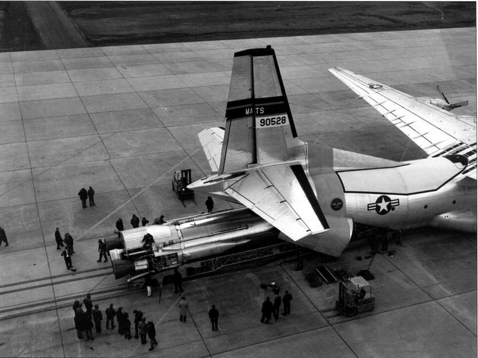 С-133 активно использовался в космической программе для транспортировки узлов ракет-носителей «Атлас», «Титан» и «Сатурн». На снимках на с.38 и 39 (вверху) запечатлен момент загрузки ракеты в самолет