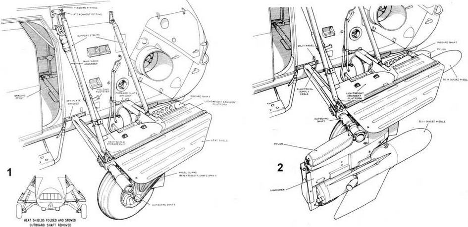 Пилоны с направляющими для ПТУР SS.11 подвешивались к платформе при помощи хомутов. Направляющую крепили к пилону взрыв-болтом. Контрольные приборы, необходимые для стрельбы управляемыми ракетами, включали в себя пульт управления ТЮК, пульт управления направляющими и двухпозиционный общий переключатель- предохранитель вооружения. Предохранитель находился на правой стороне задней переборки кабины пилотов, селектор пусковых смонтировали на кронштейне в передней части панели переключателей над головой пилотов, а пульт установили на специальном лотке над панелью переключателей между сиденьями летчиков. Интересная деталь - пульт управления мог быть легко изъят со своего места, и на то была весомая причина...