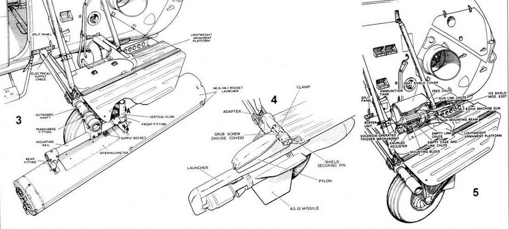 Две такие платформы устанавливались по обе стороны фюзеляжа над основными стойками шасси вертолета. Платформа представляла собой П-образную несущую раму из легкого сплава с выступающим «клыком» в передней части. Две перфорированные стойки «клыка» спереди соединялись штифтом, образуя один из узлов подвески вооружения. На него устанавливался пилон ПТУР SS.11. Пилон второй ракеты подвешивался при необходимости на короткую трубчатую балку, крепившуюся болтами в торце несущей рамы. Эта же точка была универсальной, помимо ПТУР сюда подвешивались блоки неуправляемых ракет, УР AS. 12, а также контейнер с парой пулеметов L20. Еще один двухточечный узел для неподвижной пулеметной установки находился на платформе. Коробка на 500 патронов к пулемету размещалась между платформой и фюзеляжем вертолета. Сама платформа крепилась болтами к кронштейнам на борту машины. Также к борту крепились и две опорные стойки платформы дополнительную жесткость всей конструкции придавала расчалка, закрепленная на полу десантной кабины между парой задних кронштейнов. Платформа была прикрыта металлическими экранами, защищающими установленное ракетное вооружение от теплового воздействия выхлопных газов двигателей вертолета. Еще один тепловой экран прикрывал собой установленный пулемет.