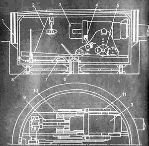 I — броневая плита; 2 — тали для подъема снарядов; 3 — казенная часть орудия; 4-.-зубчатый сектор вертикального наведения; 5 — штурвал струнного компрессора; 6 — ось башни; 7-труба гидравлической системы; 8 — опорные катки; 9- гидравлические цилиндры для поглощения энергии отката; 10 — струнный компрессор; 11 — гидравлические цилиндры для наката орудия к амбразуре;