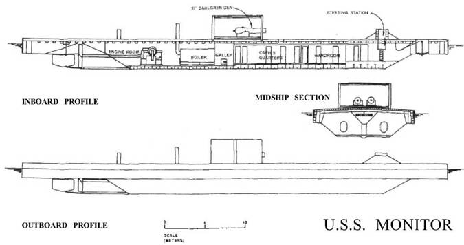 30 января 1862 года североамериканские судостроители спустили на воду корабль новой конструкции, получивший имя «Monitor». Вскоре его наименование стало нарицательным для целого класса кораблей, предназначенных для боевых действий вблизи берегов. «Monitor» нес одну башенную установку с двумя 279-мм орудиями Дальгрена. Палуба корабля возвышалась над водой всего на 0,4 м, что в сочетании с огромной (высота 2,7 м, диаметр 6,1