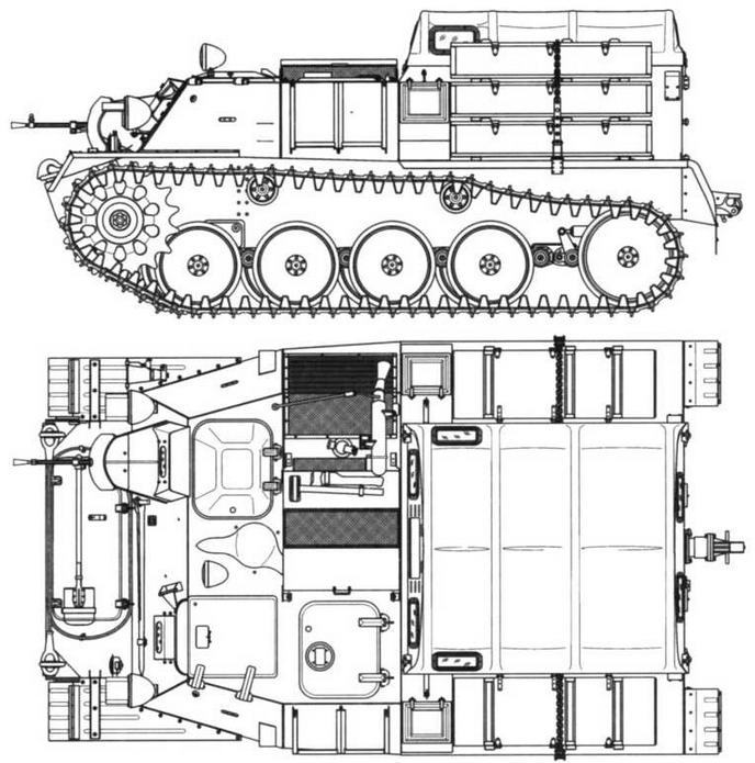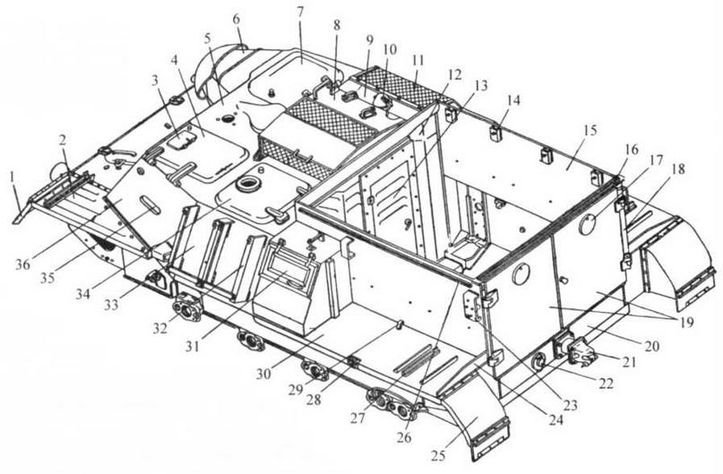 1 — передний подкрылок; 2 — переднее крыло; 3 — крышка лючка; 4 — крышка люка механика-водителя; 5 — крыша кабины; 6 — ниша пулемета; 7 — крышка люка стрелка; 8 — воздухоприток; 9 — съемный лист над радиатором; 10 — крышка лючка горловины радиатора; 11 — защитная сетка; 12 — поперечная перегородка; 13 — дверь перегородки; 14 — кронштейн для крепления дуги тента; 15 — борт платформы; 16 — верхняя поперечная балка; 17 — крышка люка; 18 — вертикальный лист кормы; 19 — кормовые двери; 20 — кормовая балка; 21 — тяговосцепной прибор; 22 — крышка лючка для розетки освещения прицепа; 23 — ограждение для габаритного фонаря и фонарей стоп-сигнала; 24 — ребро жесткости; 25 — задний подкрылок; 26 — желоб крепления тента; 27 — направляющий угольник; 28 — рейка переднего замка цепи; 29 — скоба заднего замка цепи; 30 — заднее крыло; 31 — ящик для ЗИП; 32 — укладка для грунтозацепов; 33 — задний боковой лист; 34 — крышка люка командира; 35 — смотровое окно; 36 — передний боковой лист