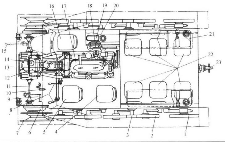 1 — направляющее колесо; 2 — опорный каток; 3 — поддерживающий каток; 4,5,16 и 22 — сиденья; 6 — бортовая передача; 7 — ведущее колесо; 8 — рычаги управления бортовыми фрикционами и тормозами; 9 — педаль главного фрикциона; 10 — педаль управления дроссельными заслонками карбюратора; 11 — полуось; 12—главная передача; 13 — коробка передач; 14 — главный фрикцион; 15 — пулемет; 17 — двигатель; 18 — вентилятор; 19 — водяной радиатор; 20 — масляный радиатор; 21 — топливный бак; 23 — тягово-сцепной прибор