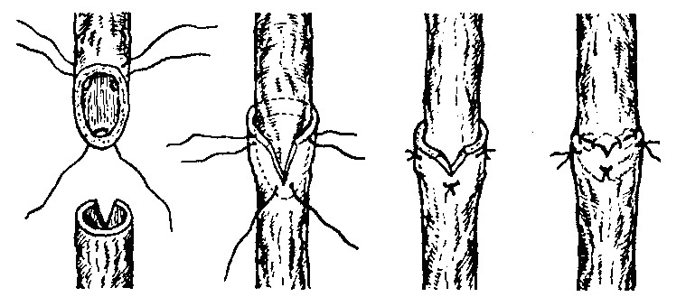 – удерживая периферический конец, ассистент помогает хирургу подтянуть нити и тем самым внедрить центральный конец мочеточника в периферический под небольшим углом; после завязывания нитей края разреза периферического отрезка подшивают к стенке центрального несколькими швами.