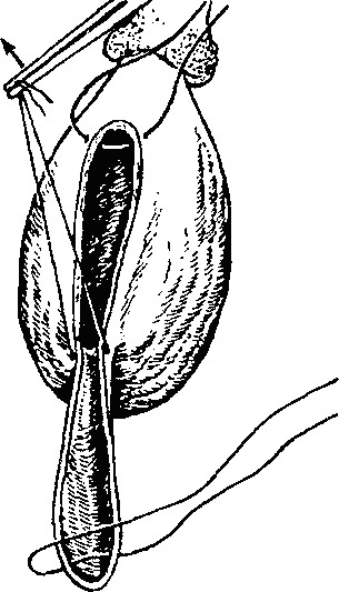 – связав временно узлом верхнюю держалку, ассистент помогает хирургу послойно зашить дефект мочевого пузыря; при наложении швов вблизи основания лоскута ассистент срезает узел и удаляет держалку;