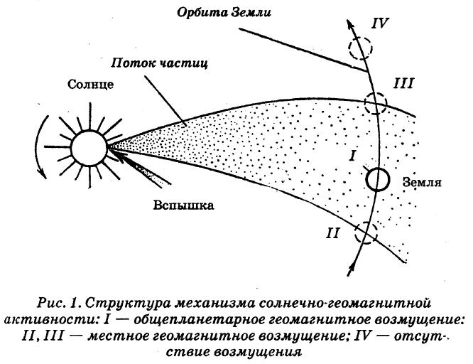 Геомагнитный фактор определяется сильным влиянием потока солнечных частиц на магнитное поле нашей планеты. Потоки солнечных частиц как бы раскачивают магнитное поле Земли, вызывая геомагнитные возмущения и возрастание индексов геомагнитной активности. В зависимости от положения Земли на орбите (см. рис. 1) эти возмущения могут носить как местный, так и общепланетарный характер. Наблюдения медиков и магнитобиологов показали, что геомагнитные возмущения оказывают сильное влияние на нейтральную и вегетативную нервную систему, выражающееся в замедлении реакции на сигнал и усилении тормозных процессов, нарушении долговременной и кратковременной