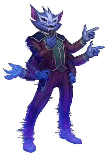 Одна из стен отъезжает в сторону, открывая неприметный постамент. А над ним разворачивается голограмма — мерцающий силуэт шестирукого существа[1], покрытого густой синей шерстью, в чём-то вроде делового костюма.