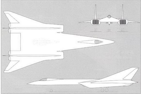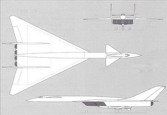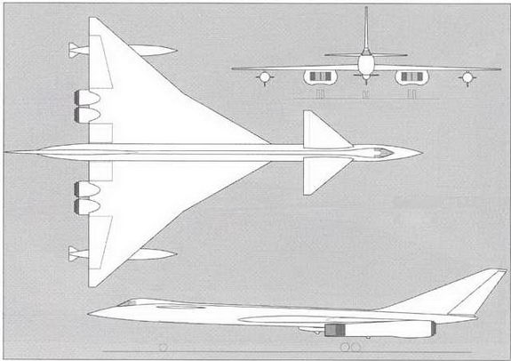 (вариант №1) Этот вариант практически полностью повторяет схему американского самолета Ь-70. Схема "утка", треугольное крыло со стреловидностью по передней кромке – 65 градусов, консольные законцовки крыла, отклоняемые в полете, двухкилевое вертикальное оперение, четыре двигателя типа НК-6 (максимальная взлетная тяга каждого 23000 кгс) в общем пакете в хвостовой части самолета. Воздухозаборники – многорежимные раздельные с вертикальным клином. Вооружение в варианте ракетоносца – одна ракета типа X-22.