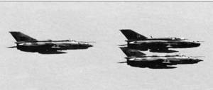 Сделанные 27 июня над Бенгази кадры обошли весь мир: два МиГ-21 бис и один МиГ- 21 УМ ВВС Свободной Ливии в полете, все самолеты несли на внешней подвеске блоки НАР.