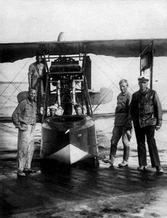 М-9 с бортовым номером «8» спускают с плавучей баржи на воду. На борту лодки видна подвешенная авиабомба. Самарский авиадивизион, лето 1919 г.