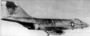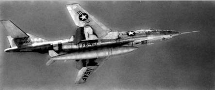 Истребитель-бомбардировщик F-105D. Под крылом виден 1705-литровый топливный бак с характерным хвостовым оперением, выполненный в корпусе не принятой на вооружение сверхзвуковой модификации