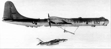 Система FICON в действии. RBF-84F 52-7269 выпущен из бомбового отсека GRB-36D 49- 2696. Авиабаза Файрчайлд, штат Вашингтон, 12 декабря 1955. Предполагалось, что бомбардировщик доставит истребитель к границе ПВО противника, выпустит там истребитель, который совершит бросок к цели, и сбросит бомбу. Затем вернётся к бомбардировщику, прицепится к трапеции и они вместе вернутся на базу. После того, как пилоты поломали несколько самолётов. Программа FICON была закрыта.