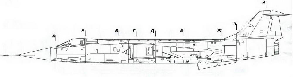 Средняя и носовая части двухместного F-104D (вид снизу)