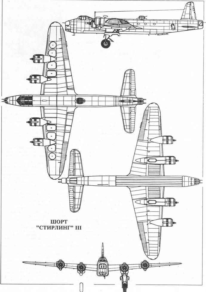 Переход с выпуска модификации I на тип III произошел на всех заводах в конце 1942 г. после того, как два "Стирлинга'Ч переделали в опытные "Стирлинги'ЧП. Принципиальное отличие между ними имелось в мотоустановке. На типе III стояли "Геркулесы" XVI с подвешенными снизу маслоради- аторами. При этом не только повысились летные данные, но и упростилось обслуживание двигателей. На "Стирлинге'ЧН также ввели верхнюю турель Фрезер-Нэш FN.50 от "Ланкастера" (задним числом ее поставили и на некоторых самолетах типа I Srs.3) и окна в задней части фюзеляжа. Обозначение "Стирлинг" II резервировалось для предполагаемого варианта с моторами Райт R-2600-A5B "Циклон", который собирались строить в Канаде. Выдали заказ на 140 "Стирлингов" II, но впоследствии аннулировали его. Тем не менее, три опытных "Стирлинга" II летали в Англии: один собрали в Рочестере и два – в Саус-Мэрстоне. На одной из стадий предполагалось вооружить модификацию II верхней и нижней турелями фирмы "Боултон-Пол" с парой 20-мм пушек каждая. Как уже говорилось, "половинный" S.31 испытывался с макетами этих турелей.