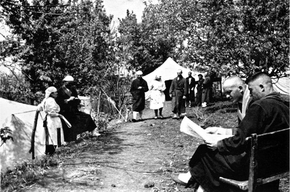 Выздоравливающие красноармейцы и медицинский персонал в полевом госпитале в годы Великой Отечественной войны