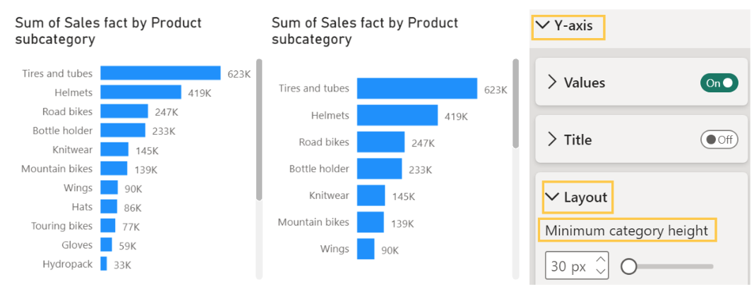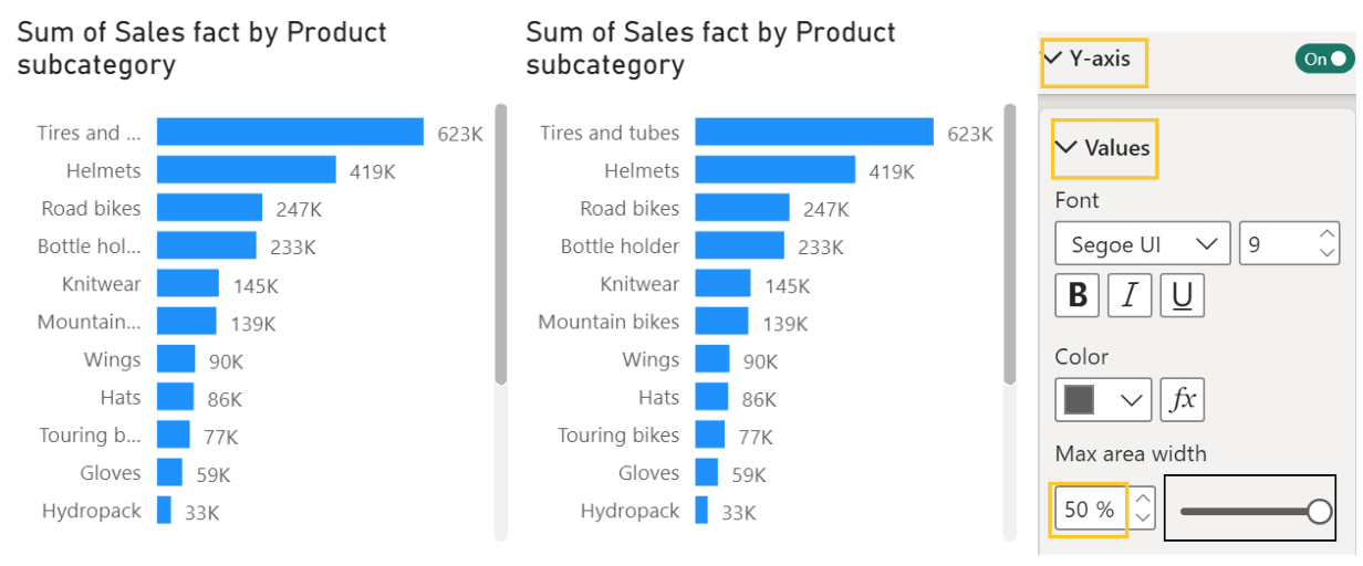 Отчет в Power BI отличается от слайдов презентации интерактивностью – данные обновляются, а количество категорий и диапазон значений изменяются в зависимости от применяемых фильтров. Поэтому, дважды проверьте, правильно ли отображаются данные и метки категорий при различных вариантах фильтрации.