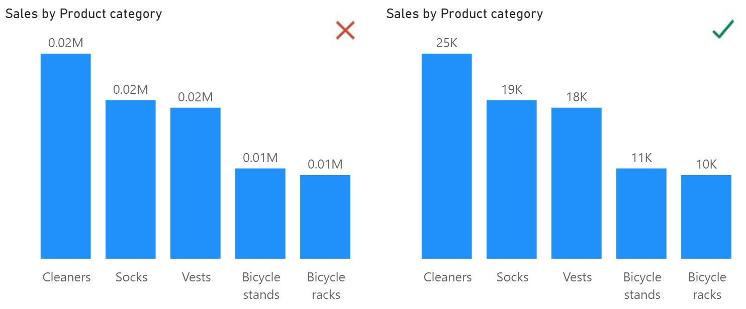 Допустим, в параметре Метки данных в Единицах измерения вы установили отображение в миллионах вместо настройки Авто (рисунок 3–4). Затем, вы применили фильтры по дате и региону, и у вас получились одинаковые метки типа 0.02M для первых трех столбцов с разными значениями. Отсюда совершенно непонятно каковы же реальные значения (рисунок 3-12 слева). В этом случае лучше переключиться на тысячи или оставить параметр Авто – он сам подставит нужные единицы измерения, как показано на рисунке 3-12 справа.