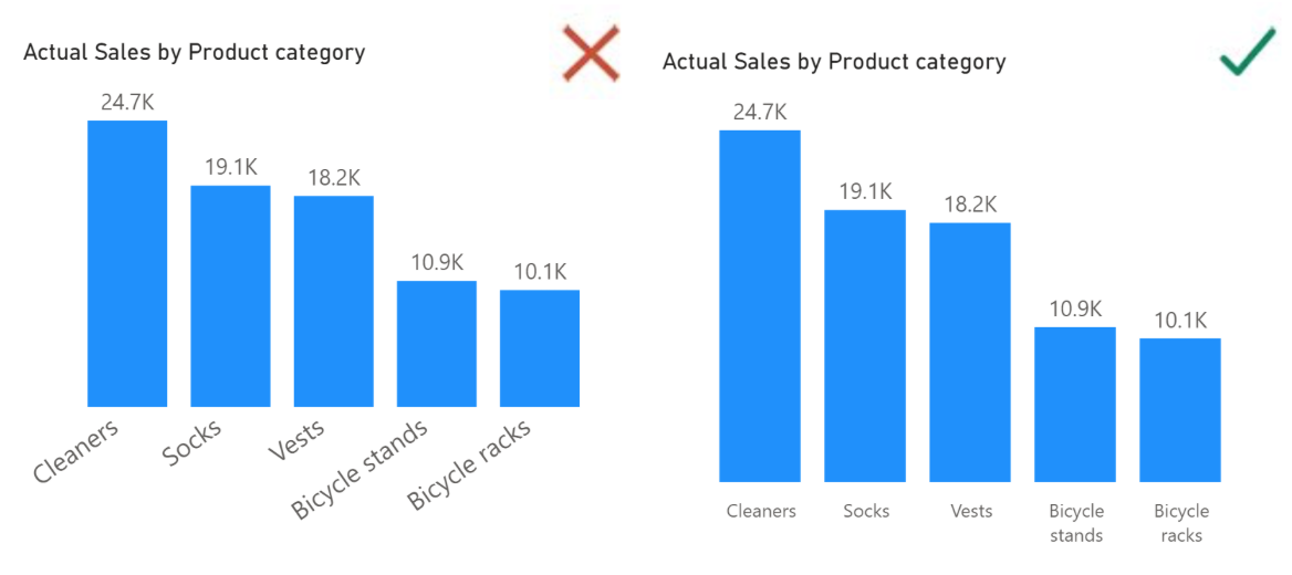 Не всегда можно увеличить ширину диаграммы так, чтобы текст на оси X уместился горизонтально. Очень часто пространство на дашборде под каждую диаграмму ограничено и нам приходится отступать от рекомендуемых для удобного чтения размеров шрифта. Так, в подписях категорий по оси Х, шрифт 12 пт мы будем уменьшать до 9-10 пт, чтобы все уместилось без поворота (рисунок 3-13).