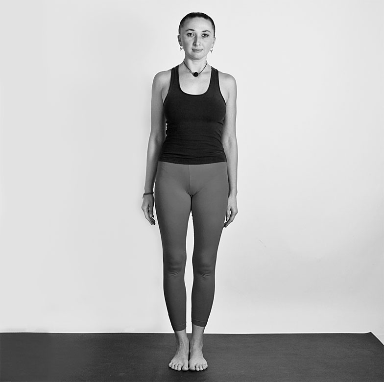 Исходное положение: стоя на полу. Встаньте прямо, ступни вместе. Пятки и плюсневые кости больших пальцев касаются друг друга. Разведите пальцы ног, опустите подушечки пальцев на пол. Распределите вес по всей ступне, подтяните коленные чашечки вверх, напрягая переднюю поверхность бедра. Напрягая ягодицы, подтяните копчик под себя. Подтяните переднюю брюшную стенку. Сведите лопатки и опустите их вниз, вдоль позвоночника. Раскройте грудную клетку, тяните грудину вверх. Подбородок параллелен полу, тяните его на себя, а макушку тяните вверх.