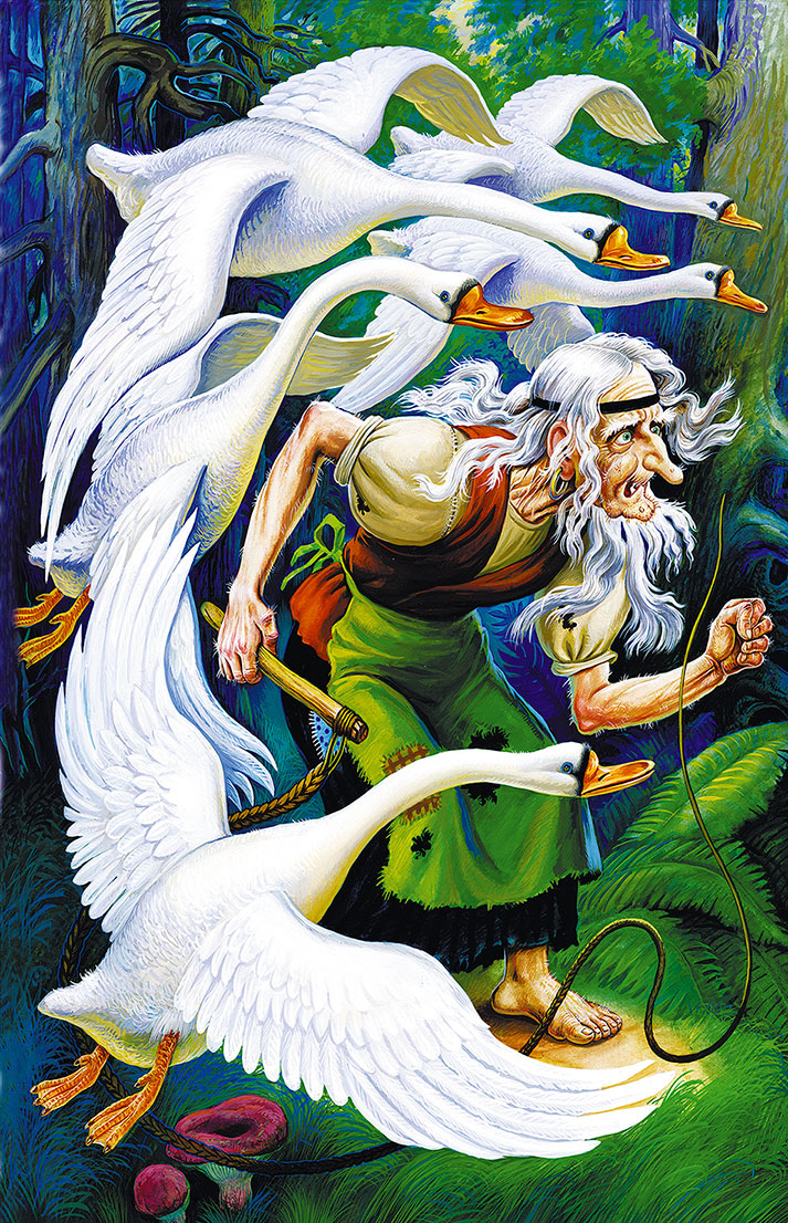 – Гуси-лебеди! Летите в погоню! Сестра братца унесла!..
