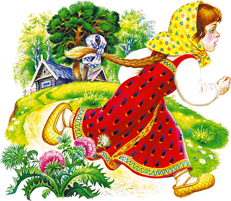 Баба-яга дала ей веретено, а сама ушла. Девочка прядёт – вдруг из-под печки выбегает мышка и говорит ей: