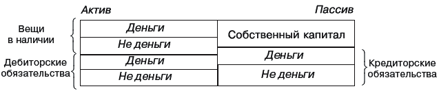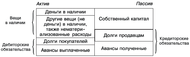 Основное, что можно извлечь из анализа баланса такого вида: мысль о неоднородности как дебиторских, так и кредиторских обязательств, а также вещей в наличии. То, чем именно они неоднородны, в официальной методологии развития не получило, но крайне важно для наших дальнейших изысканий.