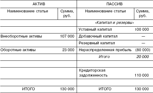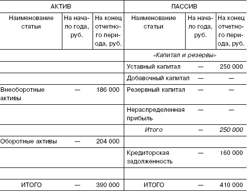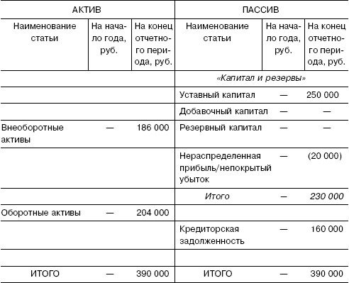 После этого бухгалтер ООО «Наше дело» рассчитал величину чистых активов. Она составляет 230 000 руб. (390 000–160 000). Ту сумму, на которую чистые активы оказались меньше уставного капитала, 20 000 руб. (250 000–230 000), бухгалтер ООО «Наше дело» указал по строке «Нераспределенная прибыль/непокрытый убыток» в круглых скобках.