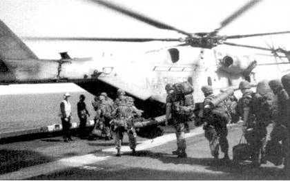 Морские пехотинцы грузятся в вертолет Сикорский СН-53Е «Си Сталлион» 26-го экспедиционного отряди корпуса морской пехоты США. Скоро они окажутся в Косово.