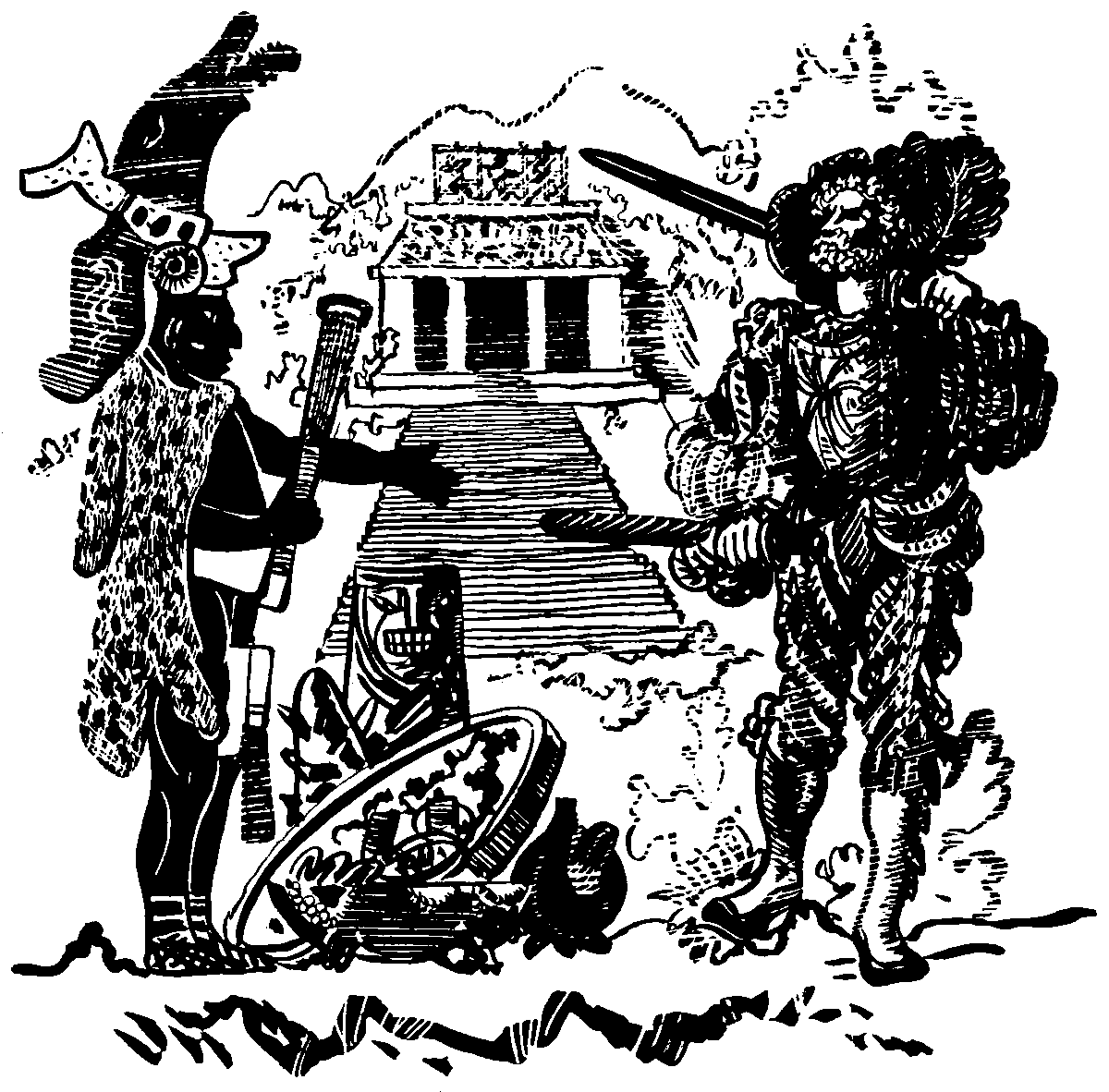 С той поры страна потонула в крови и задыхалась от ужаса. Во имя христианского бога и короля испанского, с одним только стремлением к обогащению испанские конквистадоры покорили всю страну огнём и мечом, оружием и распятием, силой и предательством. Их совесть застилало только одно страшное слово — «золото». Миролюбивый народ, приветствуя их, протянул им руки. Но испанцы отрубили эти руки и содрали с них золото.