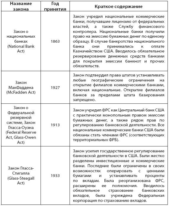 Таблица 1. Основные федеральные законы, регулирующие банковскую деятельность в США.